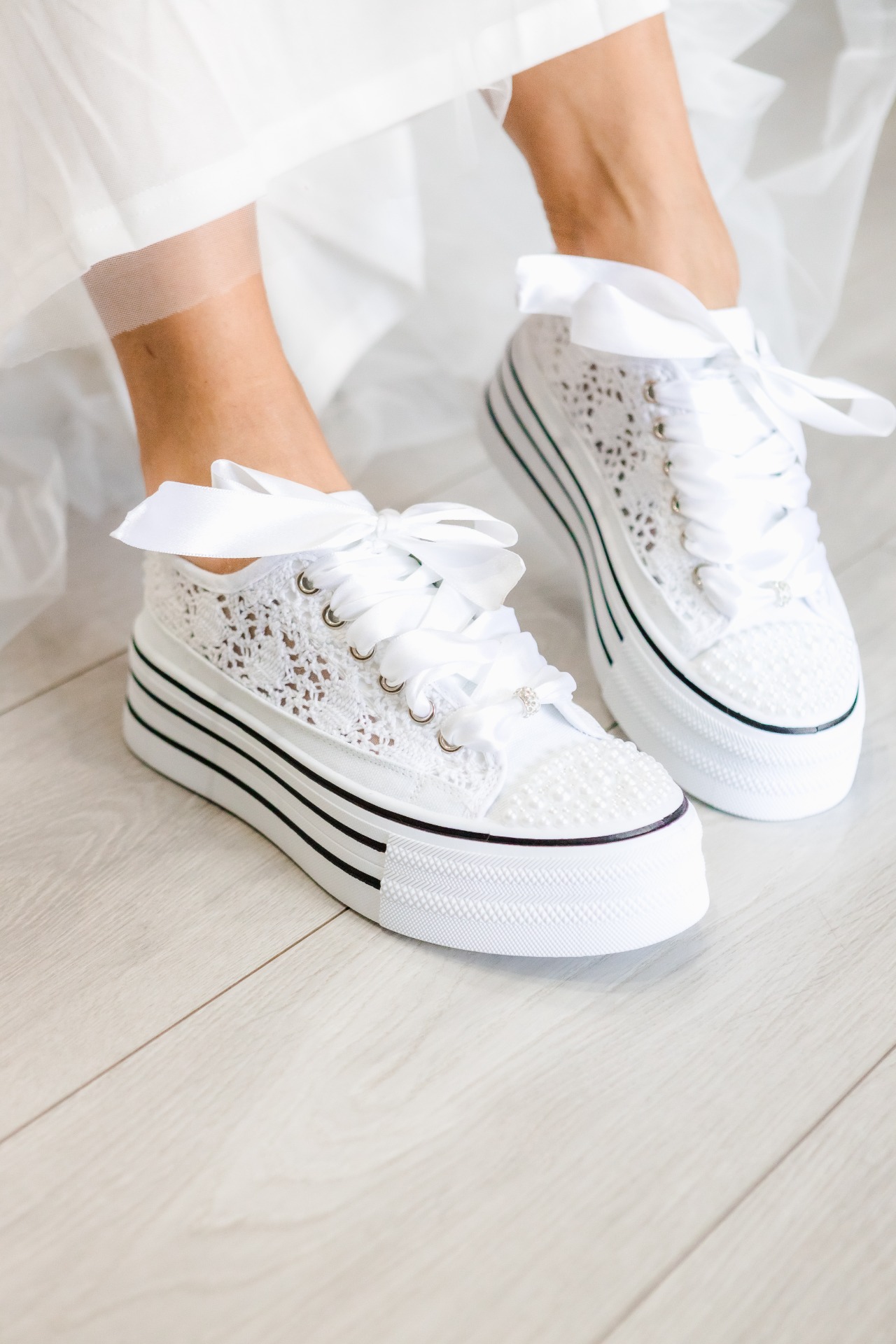 V čom sú jedinečné? Spájajú v sebe tri svety – luxus čipky, eleganciu periel a moderný strih platformy. Sú to tenisky pre nevestu, ktorá chce byť vysoká, elegantná, no zároveň sa chce cítiť slobodne pri každom tanci.
